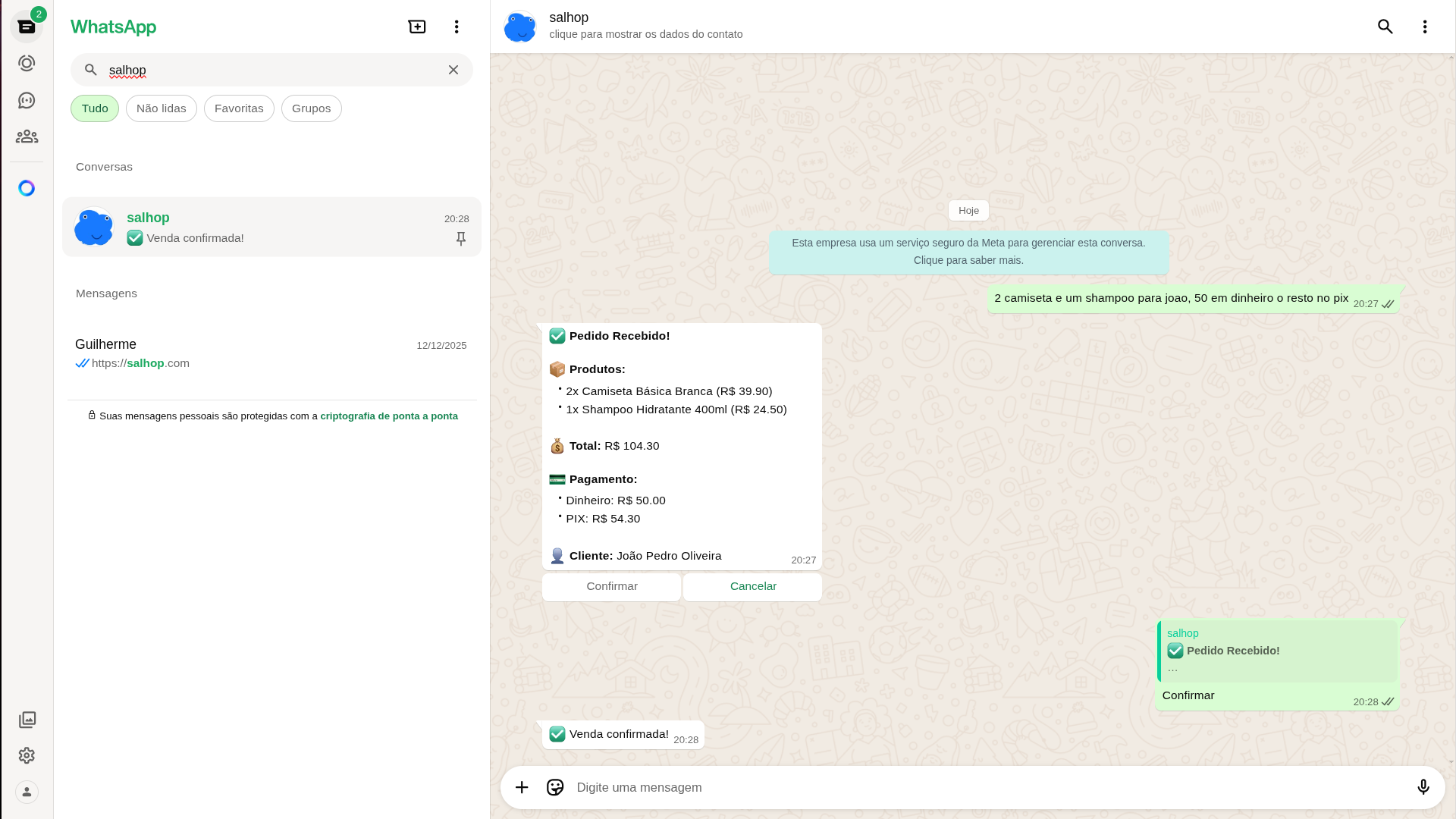 Simples: mande um áudio ou texto tipo "duas cocas no pix" pro Salhop no WhatsApp. A IA entende e registra a venda automaticamente no sistema. Sem sair do WhatsApp.